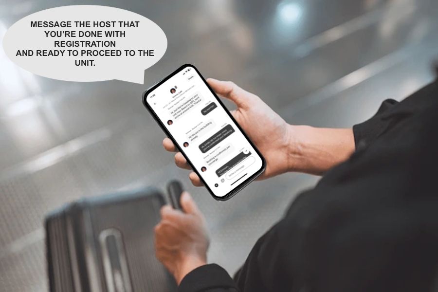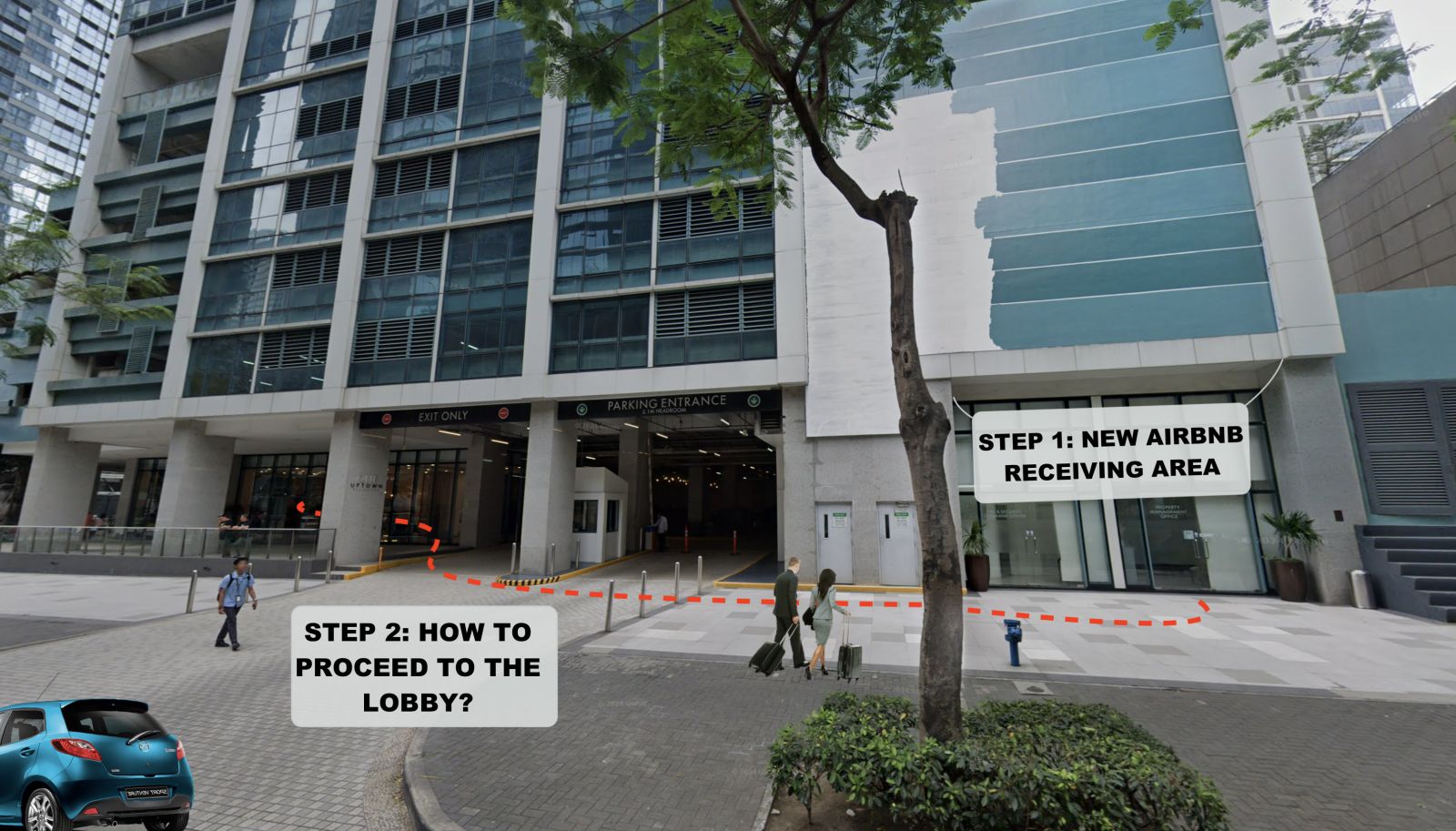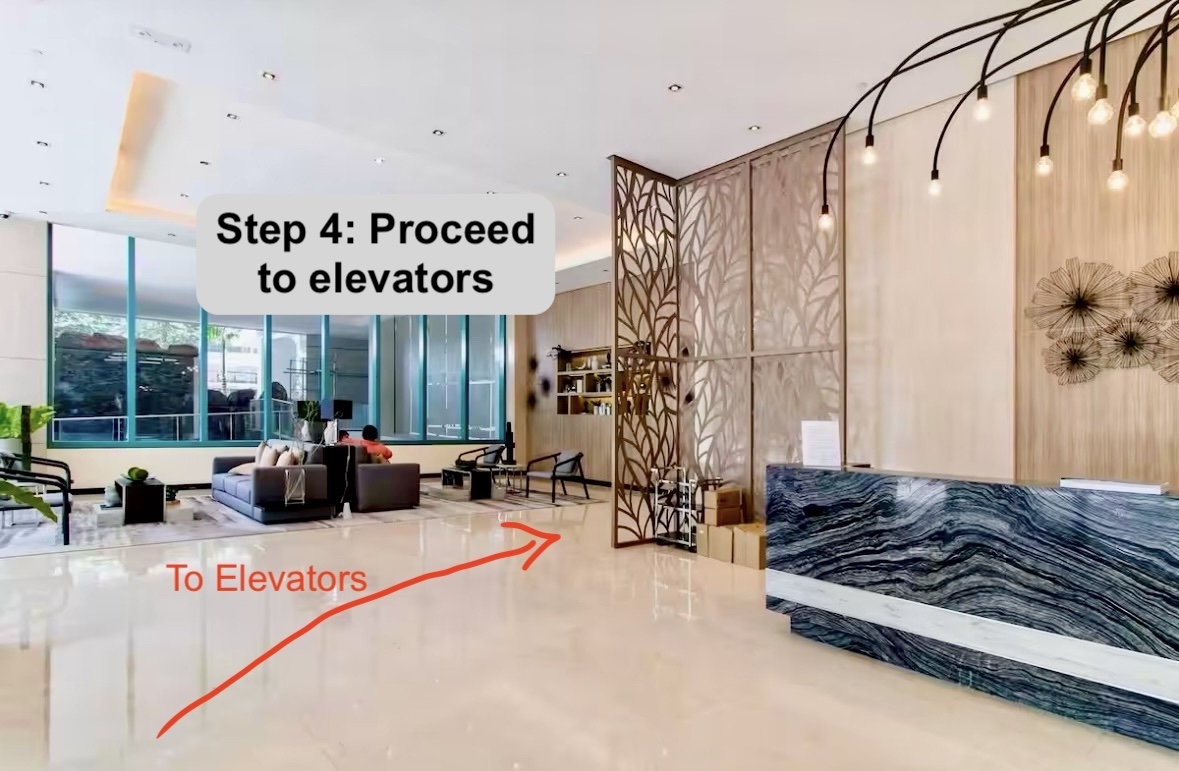 Step 1: Enter the receiving area on the right side of the parking entrance and register with your Passports/IDs, you will get a RFID card for the elevator