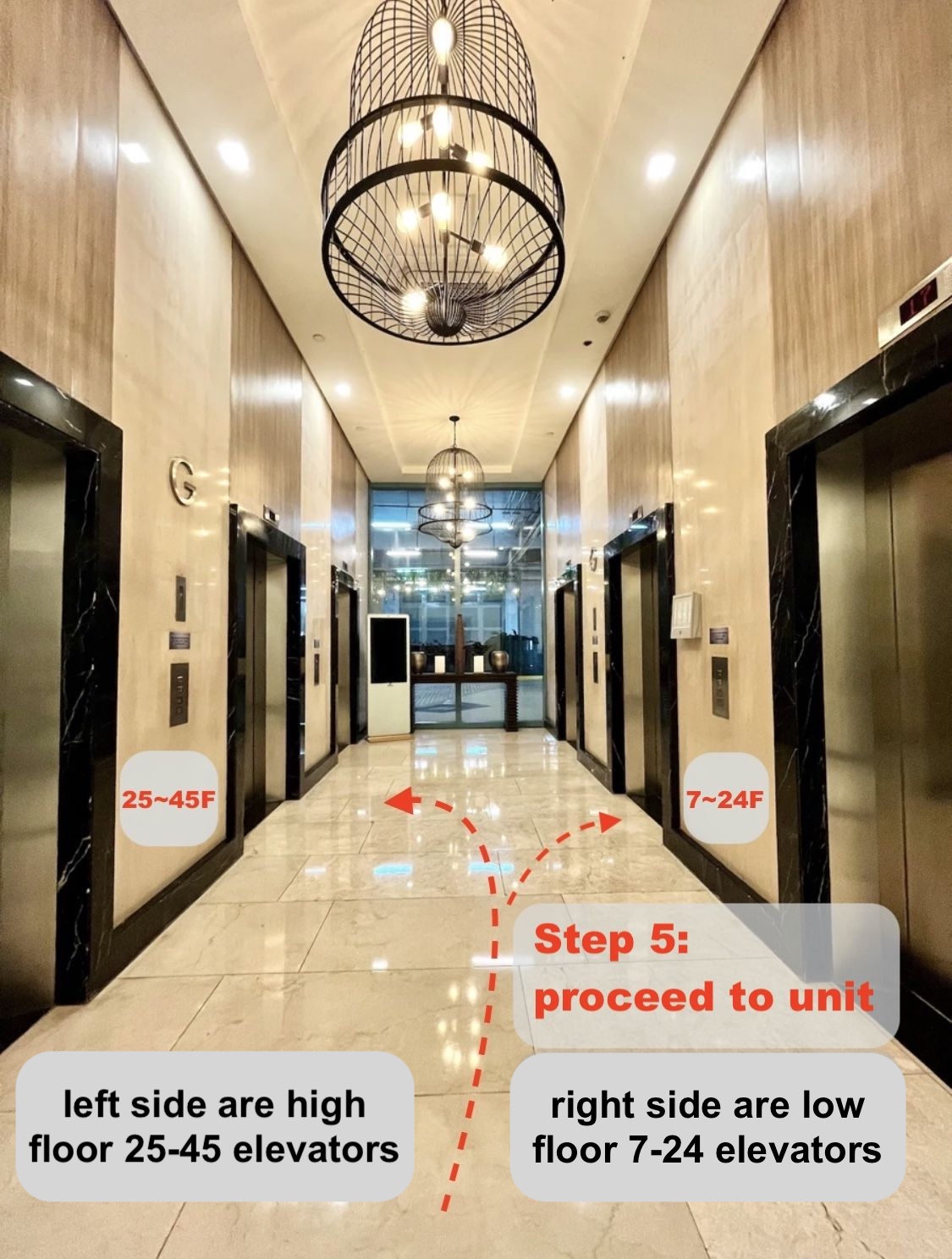 Step 5: The left elevators are for floors 25-45 and the right elevators for floors 7-24